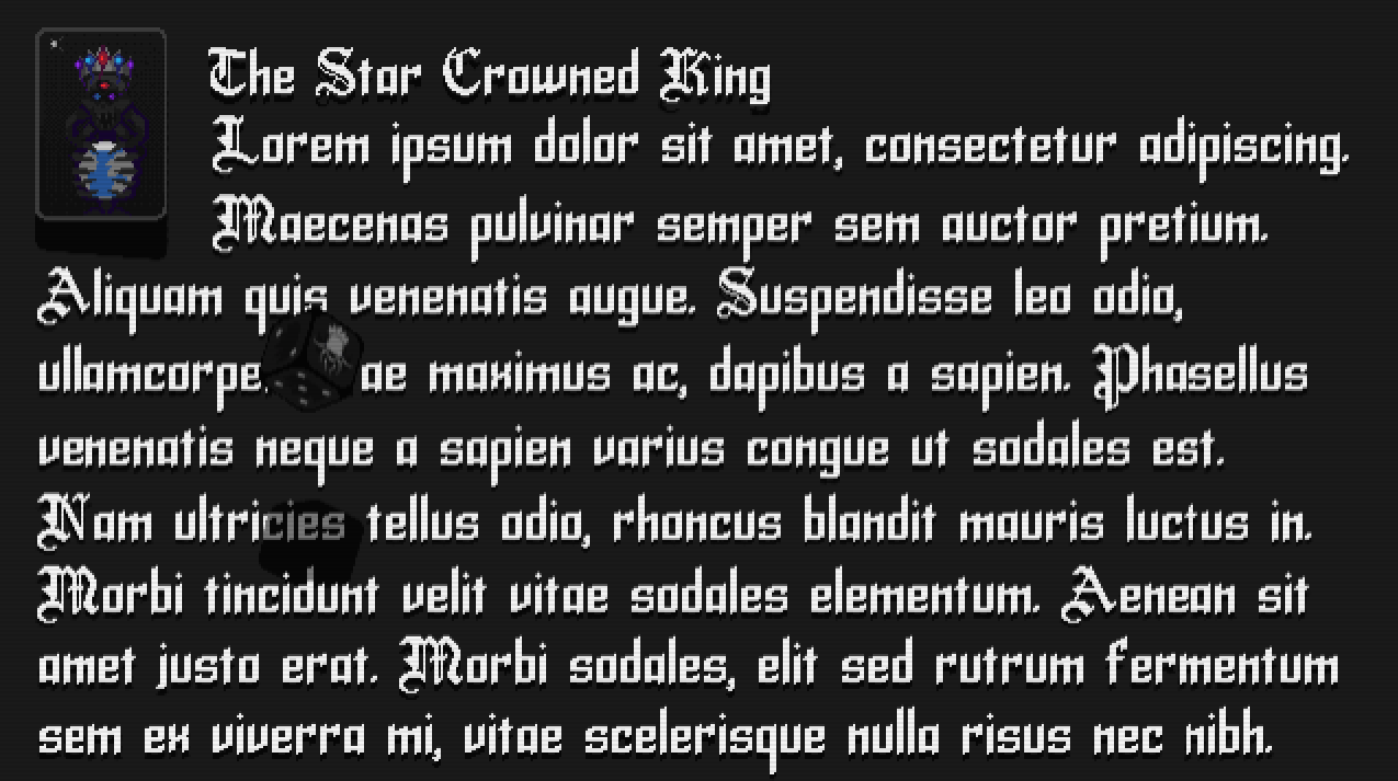 The goal of this font was to be readable for in-game text while also being ornate and flashy when it needs to be.